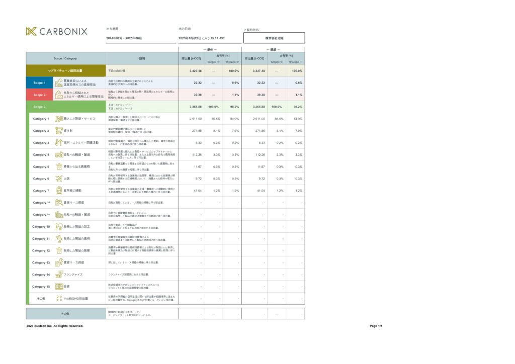 併せて掲載している温室効果ガス排出量算定レポートは、現時点の算定結果および分析内容を示したものであり、将来の削減効果や実績を保証するものではありません。スコープ3(サプライチェーン全体における間接排出)については、算定範囲の特定やデータ精度の向上を段階的に進めており、継続的な測定および削減に取り組んでまいります。