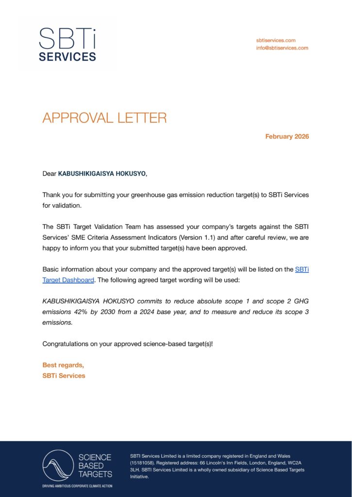 株式会社北翔は、SBTi(Science Based Targets initiative)より、温室効果ガス排出削減目標の認定を取得しました。